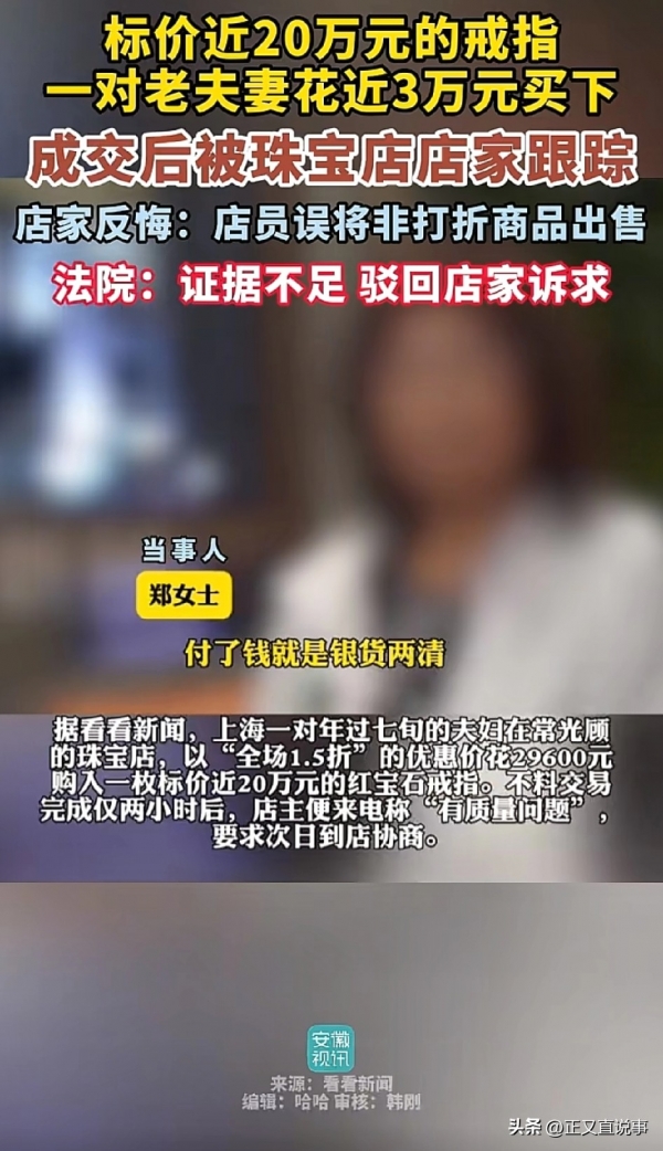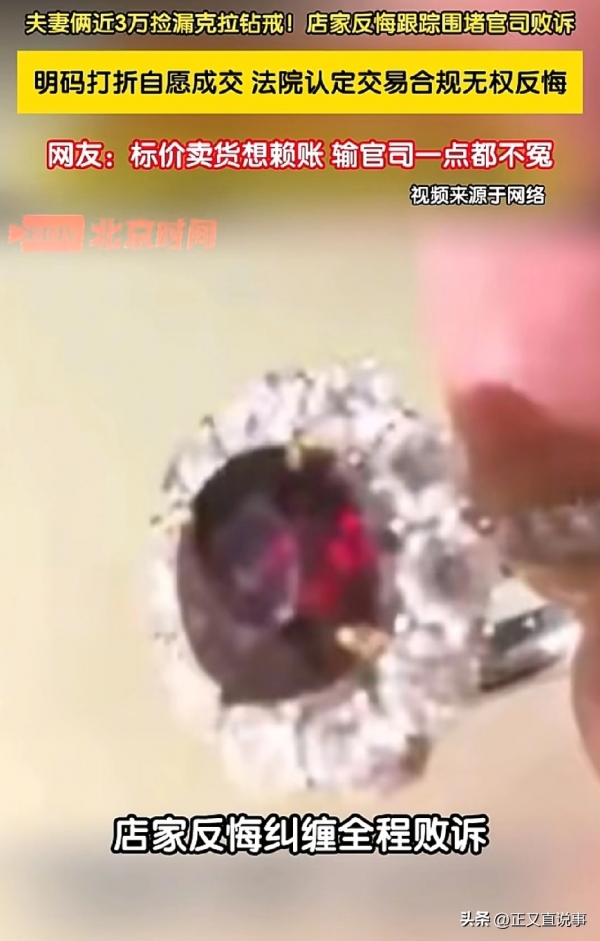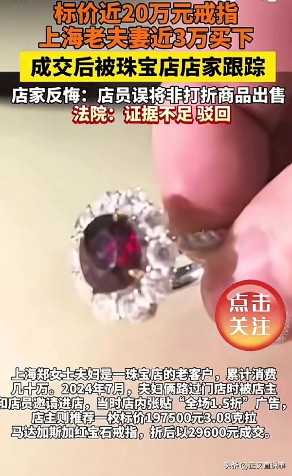标价近20万的红宝石戒指,老客户以2.96万元的折扣价拿下,原本以为这是对老客户的"福利回馈",没想到被店主告上了法庭。