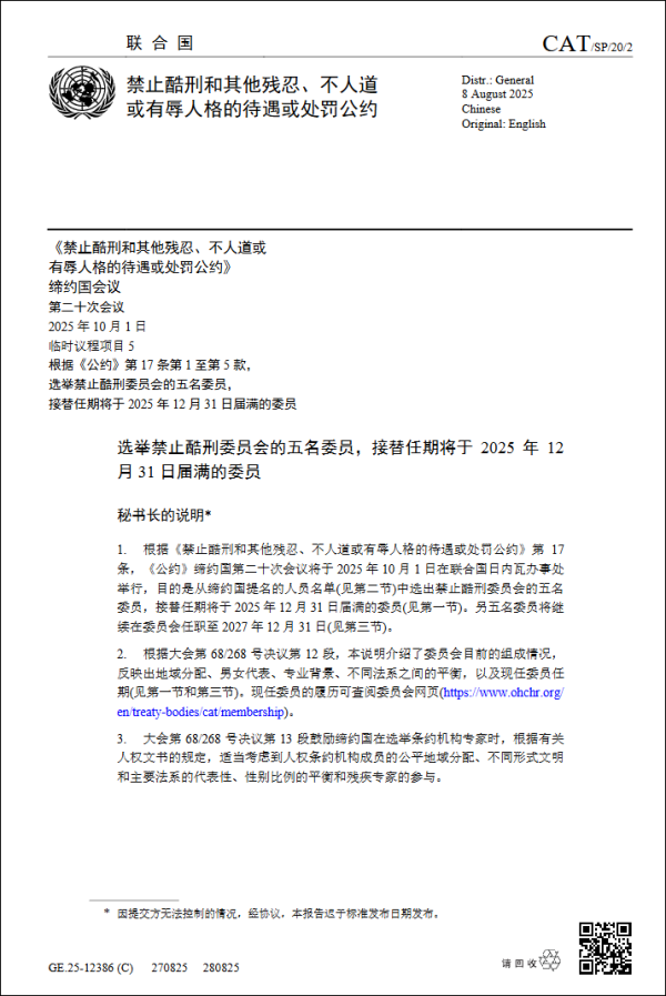 联合国网站消息,《禁止酷刑和其他残忍、不人道或有辱人格的待遇或处罚公约》缔约国会议第二十次会议于10月1日召开,期间选举禁止酷刑委员会的五名委员,接替任期将于2025年12月31日届满的委员。
