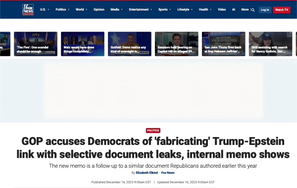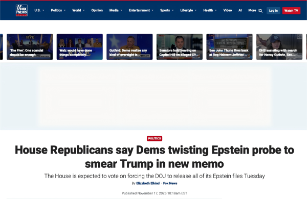 《福克斯新闻》的报道,标题是《众议院的共和党人称,民主党人通过歪曲解读一份新公布的爱泼斯坦的备忘录来攻击特朗普》
