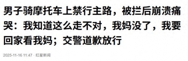 面对交警的拦截,他哽咽着说出那句让无数网友泪崩的话:"我知道这么走不对,我妈没了,我要回家看我妈。"随后崩溃痛哭。
