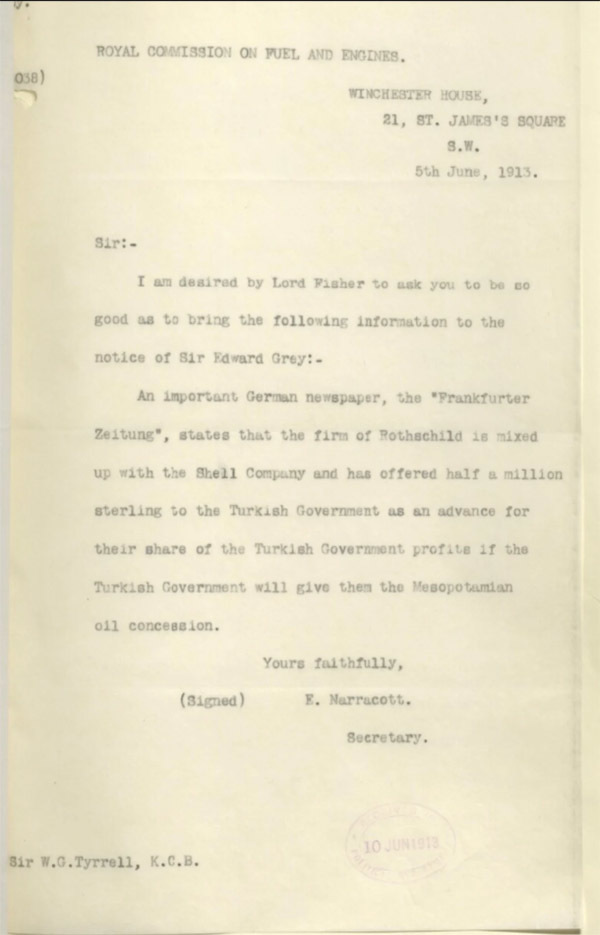 1913年的一份文件(IOR/L/PS/10/300)显示,"罗斯柴尔德公司"曾向土耳其政府提供50万英镑,以获得美索不达米亚的特许权,并与壳牌公司有关联。罗斯柴尔德家族已经通过其在高加索的炼油厂以及与荷兰皇家壳牌公司的协议控制了全球石油贸易的大部分,他们把这一地区视为其能源帝国的自然延伸。尽管官方历史把缅甸石油公司的所有权归于苏格兰的嘉吉(Cargill)家族,但罗斯柴尔德家族在地区棋盘上的存在是无可争辩的,并且暗示了一张值得进一步调查的金融影响网络。