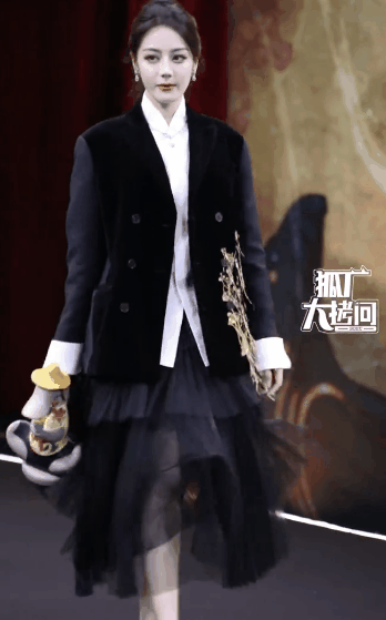 这次迪丽热巴宣传了新剧《慕胥辞》,黑色新中式西装搭配黑色纱裙,高马尾的造型利落英气,手持象征剧中女主的灯笼,又美又飒。