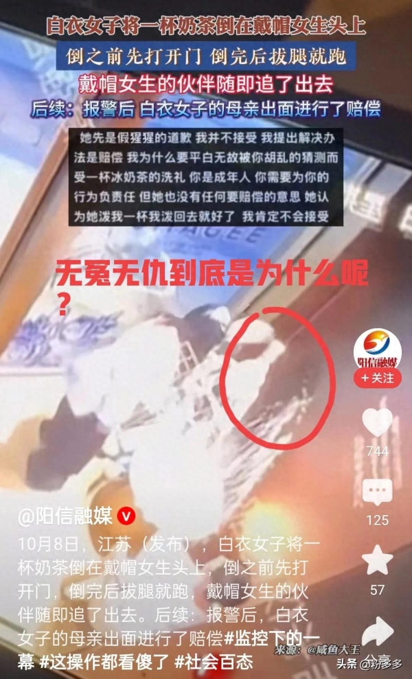 近日,江苏一女子也遭遇了这样的奇葩事。她和同伴喝奶茶时,突然被一陌生白衣女子用奶茶浇头了。监控视频里,白衣女子先是打开了店门,随后走到戴帽子的女子旁边,将一杯奶茶从其头顶浇了下去,随后拔腿就跑。女子的同伴见状,立马起身就追了出去,抓住了给他朋友泼奶茶的白衣女子。