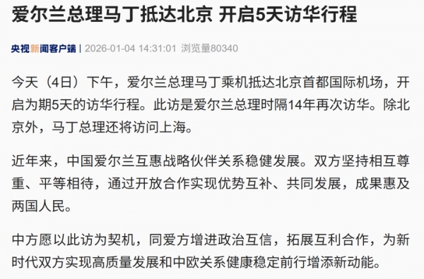4日下午,爱尔兰总理马丁乘机抵达北京首都国际机场,开启为期5天的访华行程。此访是爱尔兰总理时隔14年再次访华。除北京外,马丁总理还将访问上海。