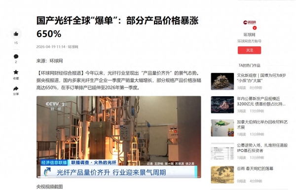 根据央视报道,2026年中国光纤需求暴涨,有些企业排产都排到明年一季度了。而且就算部分光纤种类价格涨了六倍,还是供不应求。
