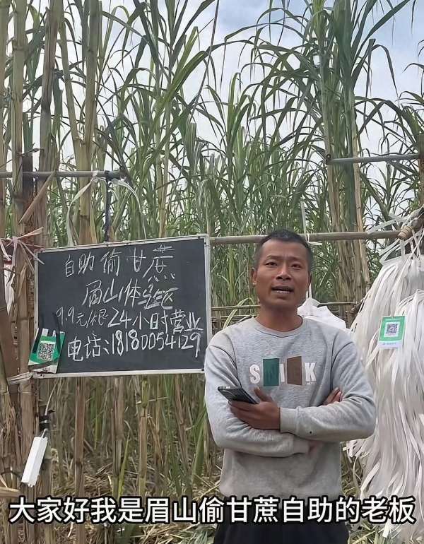 当天中午,甘蔗地里就挂起黑板,写着"9.9元一根,24小时营业",还备好砍甘蔗的刀,规则很简单:砍完甘蔗带出地就算赢,老板只象征性追赶。消息发出去当晚,就有三四批游客赶来体验,童鹏飞追了半宿,没抓到一个"小偷"。