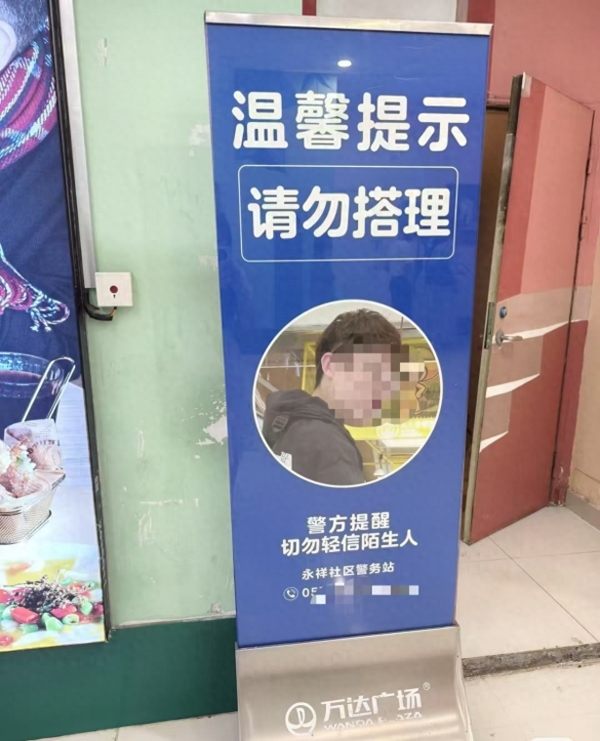 近日,浙江义乌万达广场一提示牌引发关注,提示牌上张贴一男子的照片,并被标注"请勿搭理""警方提醒切莫轻信陌生人"并附有永祥社区警务站电话。