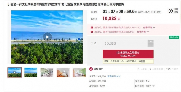 11月22日,极目新闻记者在某网络拍卖平台搜索"乳山海景房"发现,目前有多套银滩海景房正在拍卖,面积大部分为50到100平方米,起拍价为1万元左右。记者随机挑选了一套与该网友类似的房型看到,这套待拍卖的二手房户型为二居室二厅一卫,面积为60.60平方米,竞买公告显示:起拍价为10888元;保证金为12000元;加价幅度为100元或整倍。目前这套房距拍卖开始还有1天7小时左右,已吸引了195次围观,有9人设置提醒,但暂无人报名。
