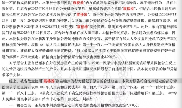 在四川省乐山市2025年的一起判例中,原告因楼下邻居长期使用震楼器,被诊断为焦虑抑郁状态,被迫外出租房六个月。法院最终酌情判决被告赔偿精神损害抚慰金2000元。