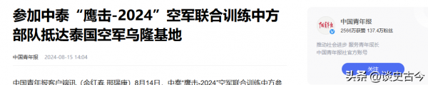 8月14日,我国与泰国举办中泰"鹰击-2024"空军联合训练,我国的参训部队乘坐运输机来到了泰国的军事基地。