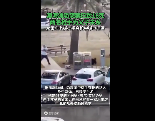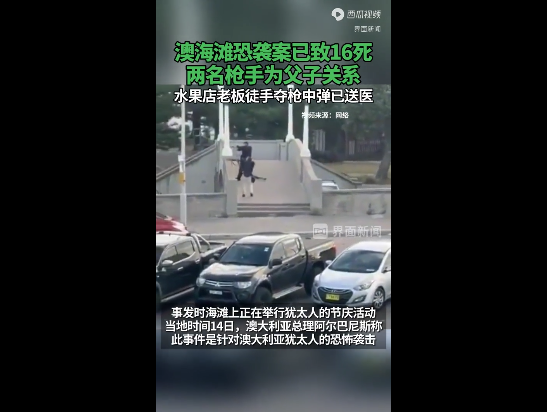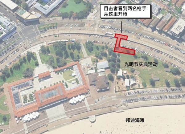 澳警方说,当时海滩上正在举行犹太人的节庆活动。报道称,在一段由ABC独立核实的视频中,可以看到两名男子站在海滩北端的水泥人行天桥上,向下方聚集的家庭和人群开枪扫射。