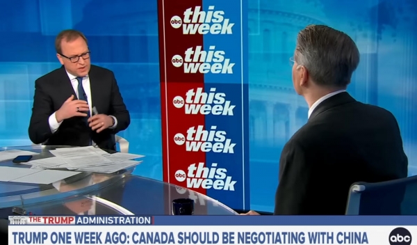 在美国广播公司(ABC)25日的《本周》节目中,在回应特朗普为何再次以贸易战威胁加拿大时,贝森特称,"美国与加拿大拥有高度一体化的市场,商品在生产过程中可能会跨越边境达六次之多,我们绝不能让加拿大成为中国向美国倾销廉价商品的突破口。"
