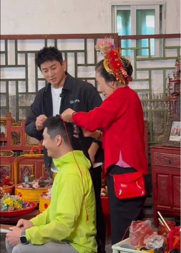 在簪花店里,阿婆先给邢傲伟扎头发。因为男生头发比较短,阿婆只能揪起一小撮头发来绑。轮到吴奇隆时,他的头发更短,阿婆费了好大劲才给他扎好。
