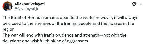 伊朗最高领袖顾问:霍尔木兹海峡对伊朗人民的敌人将永远关闭 2026-04-02 15:30 观察者网 当地时间4月2日,伊朗最高领袖外事顾问、前外长韦拉亚提在X平台发文表示,霍尔木兹海峡对世界开放,但对伊朗人民的敌人及其在该地区的据点将永远关闭。 "战争的结束取决于伊朗的决策和力量,而不是侵略者的妄想和傲慢。"韦拉亚提写道。