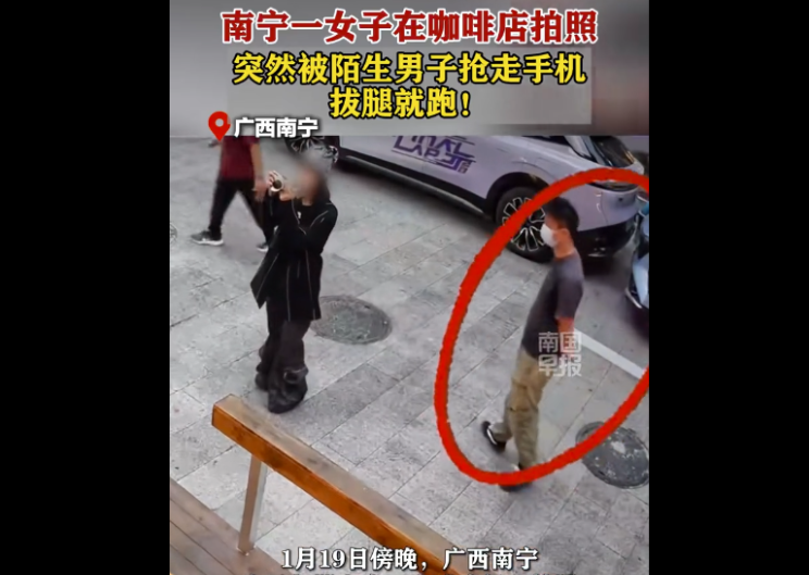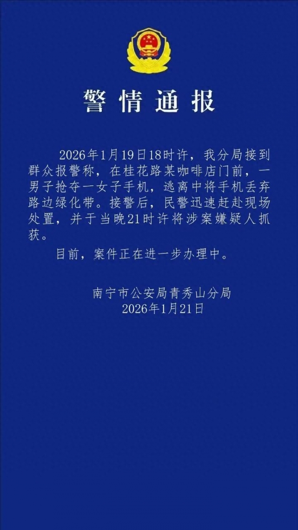 中国网1月21日讯据青秀山警方微信公众号消息,1月21日,南宁市公安局青秀山分局发布警情通报。1月19日18时许,南宁市公安局青秀山分局接到群众报警称,在桂花路某咖啡店门前,一男子抢夺一女子手机,逃离中将手机丢弃路边绿化带。