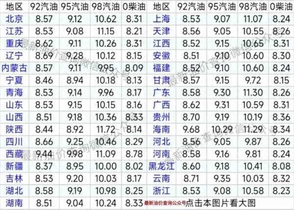 在3月24日0时油价刚进行了今年第6次油价调整,不过油价继续大涨超过1115元/吨,实现了创历史纪录的油价大涨,目前92号汽油大部分地区已经涨超8.51元/升,95号汽油大部分地区已涨到9.15元/升左右,0号柴油价格大部分地区更是涨到8.25元/升范围,今早油价大涨后,全国最新的92,95号汽油与0号柴油价格请看文末价格列表。