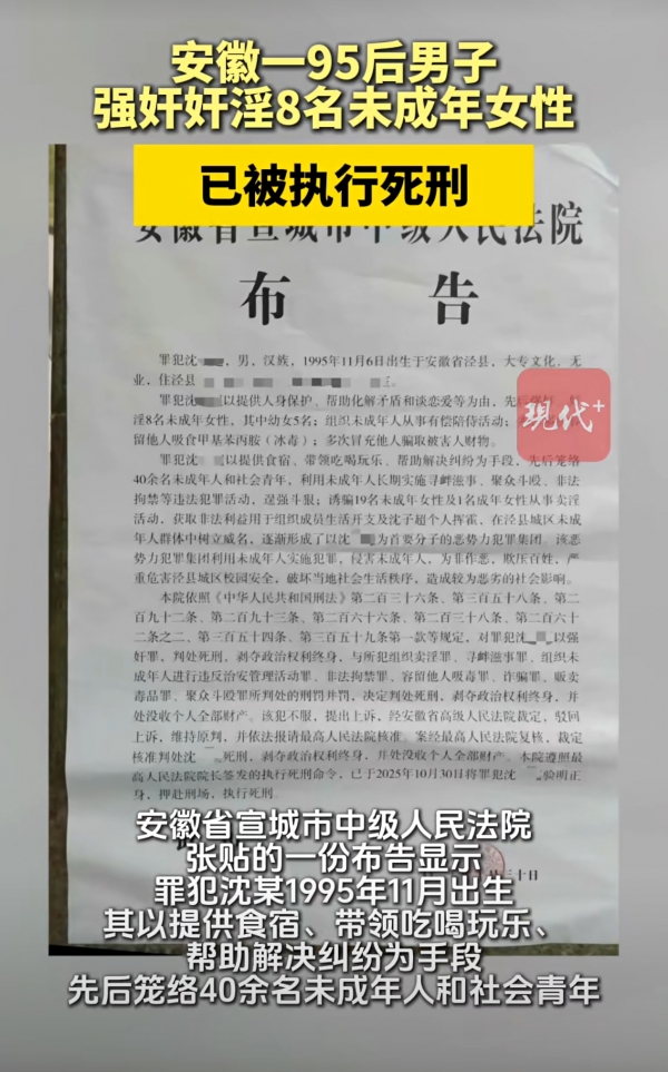 安徽宣城一95后男子沈某,因为强好多名未成年女性(其中还有5名幼女),还长期带着人聚众斗殴、非法拘禁,10月30日被执行死刑了!