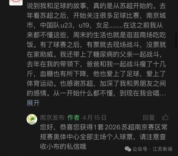 起因?她在"南京发布"一篇讨论"苏超"新赛季的帖子底下,真情实感地写了一段留言。