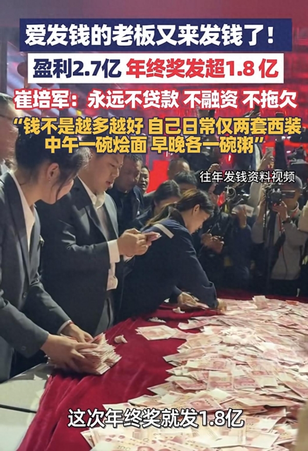 2月12日,河南一企业老板拿出近1.8亿元发年终奖,现场现金超6000万元,七千员工携家属赴宴。一句"年轻人压力大,能减轻一点是一点",戳中无数打工人的心。