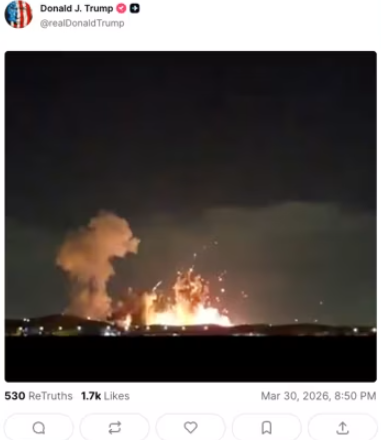 美国总统特朗普3月30日晚间在"真实社交"平台发布了一段无配文视频,视频中发生一连串大型爆炸,照亮夜空。前述美国官员称,这段视频记录的正是此次袭击过程。