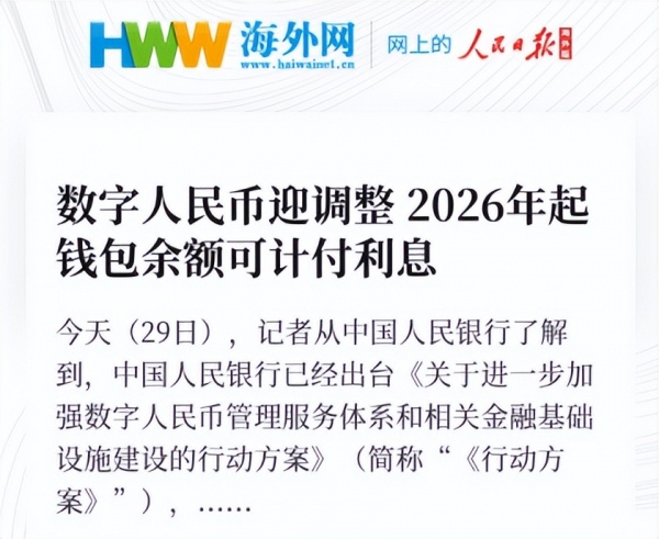 这次热度的核心,是央行把数字人民币下一步怎么走说得更清楚了。央行主管媒体披露,人民银行将推出《关于进一步加强数字人民币管理服务体系和相关金融基础设施建设的行动方案》,并明确"新一代数字人民币"的计量框架、管理体系、运行机制和生态体系将从 2026年1月1日 起启动实施。