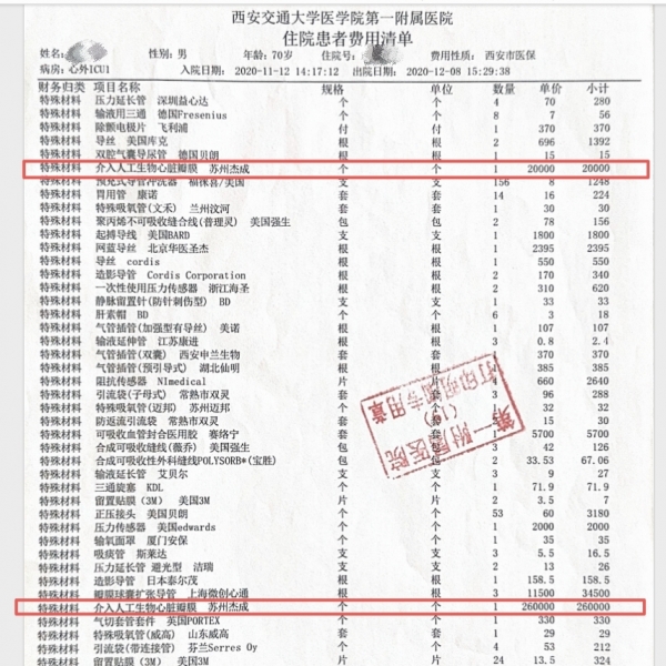 李女士称,2020年8月,其父亲在西交大一附院查体时,通过B超发现主动脉瓣中度狭窄,"当时心外科医生主动找到我们,建议我们做心脏手术,表示虽然我父亲目前没有任何症状,但如果不做手术,会有随时猝死的风险。"李女士告诉记者。同年11月患者入院手术。术后患者昏迷,被转入ICU,家属却被告知患者手术成功,生命体征平稳。因对治疗效果存疑,家属决定转院,结算总医疗费用60余万元,医保报销29万余元,家属自费30余万元。"仅一副国产心脏瓣膜自费费用高达28万元,而术前院方并没有告诉我们。"李女士说道,术后46天,父亲不幸离世。