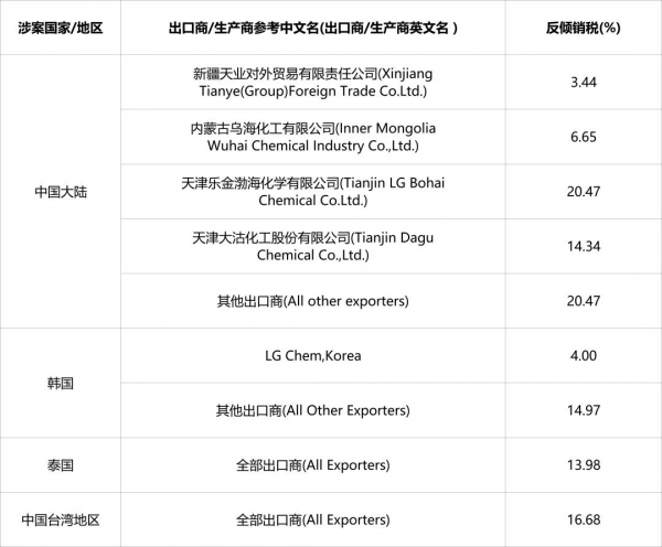对中国大陆出口商/生产商征收的反倾销税率为 3.44%~20.47%。