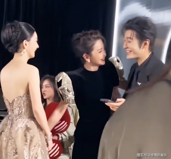 去年微博之夜的后台,有网友拍到李冰冰、赵丽颖和黄晓明三人窃窃私语的画面。
