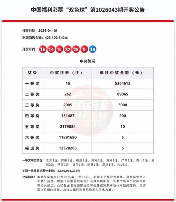 4月19日,福彩双色球第2026043期开奖,全国共开出16注一等奖。其中,江苏2注一等奖,全部花落苏州,中奖金额分别为536.46万元和540.36万元。