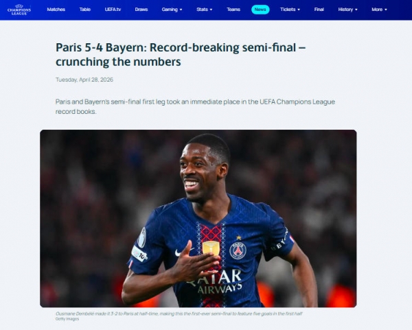 从数据纪录的角度看,这场比赛创造了历史。9个进球,让这场巴黎对拜仁的比赛成为欧冠改制以来,半决赛单场进球最多的比赛,直接登顶历史第一。这不仅仅是超越,更是对历史认知的刷新--此前半决赛单场最多不过7球,而这场对决将标杆提升了整整两球。