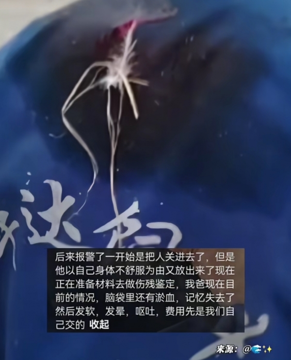其儿子还称,其父亲脑出血,情况不好,被医院下了病危通知书,而打人的黑衣男子却以身体不舒服为由,已经放出来了。