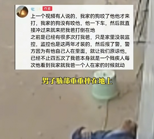而事后呢,被打男子的儿子称,这名黑衣男子已经有很多次殴打他的父亲了,其父亲有残疾,黑衣男子见他一个人在家就动手。当时报了警,但是因为这名黑衣男子家里有人,就要求被打者家人原谅。