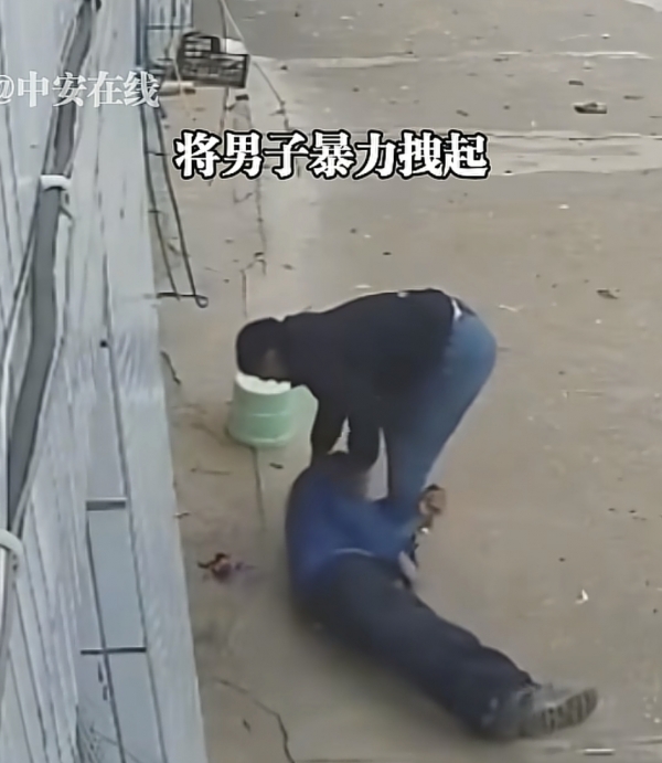 过了四分钟左右,黑衣男子又返回,见人倒地后没有起来,便将人给拽了起来。