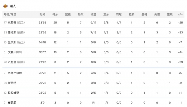 湖人的五位首发球员在场上显得疲软无力,面对火箭年轻球员的冲击力,他们几乎没有任何有效的招架手段。阿门在比赛中凭借26分的抢眼表现,而作为火箭的核心,杜兰特展现了定海神针般的作用,全场贡献25分,在关键时刻的稳健发挥彻底杀死了比赛悬念。反观湖人这边,虽然东契奇和詹姆斯两人合力拿下了43分,但这种看似不错的进攻数据却掩盖不了防守端的全面溃败。东契奇全场的正负值为-25,而詹姆斯更是跌到了令人惊诧的-33。即便火箭队的中锋申京全场仅出手了7次,却依然能通过高效的策应和篮板保护让湖人的禁区变得千疮百孔。湖人的替补阵容同样无法提供火力支持,他们机械地往返奔跑毫无斗志可言。八村塁的表现堪称灾难,他在长达28分钟的出场时间里6投0中,全场1分未得,正负值更是低至-29,是全队唯一没有任何分数入账的球员。