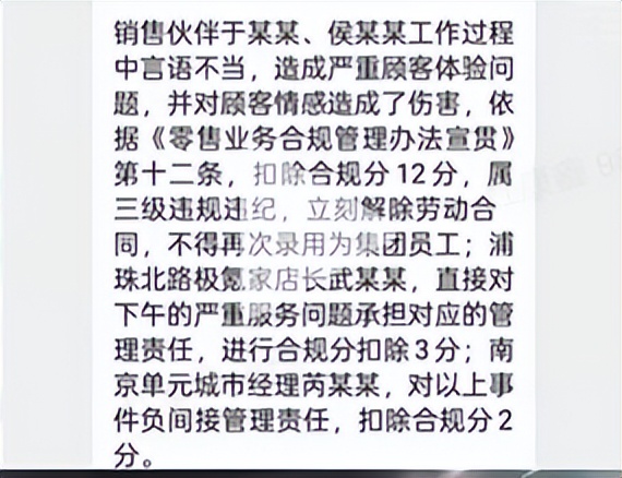 随后该消费者发帖称,极氪汽车相关负责人在得知情况后,已经和他沟通了后续的处理情况,该负责人表达了歉意,"我们的销售伙伴和主播伙伴表述极为不得体,这不是公司和团队的本意,也违背了品牌行为规范"。此外,这名负责人在给消费者的回复中表示,涉事的两名工作人员已经被解除了劳动合同,且不得再次录用为集团员工。