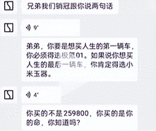 而这名销售人员在得知情况后,发语音说,"你要是想买人生的第一辆车,你必须得选极氪01,如果你想买人生的最后一辆车,你肯定得选小米YU7,你买的不是259800,你买的是你的命,你知道吗?"这样的回应也让消费者感到不适,并回复"没必要吧,咒我?"