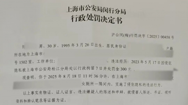 8月18日,该局对此案作出行政处罚,查明李坤于2025年8月18日在公共女厕所一隔间内,实施了侵犯隐私的违法行为。并对李坤处以行政拘留7日,处罚金300元。