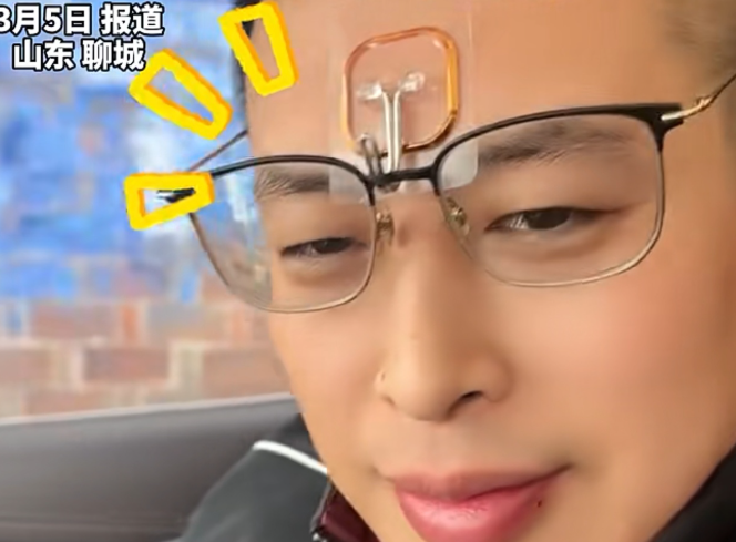 大哥自制的这幅"鼻部脚手架"完美解决了问题,眼镜就这么悬空挂着,完美避开了脆弱的鼻梁,虽然脑门上好似开了个"天眼"!