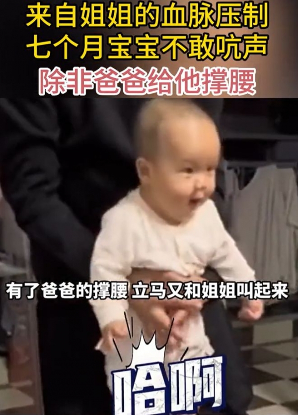 笑死了!湖南,7个月的宝宝在家里哭喊着不停,姐姐走上前对他喊了一句,宝宝瞬间不敢吭声,而当爸爸将他抱起后,宝宝就好像找到了靠山,对着姐姐反吼回去,网友:小屁孩都知道审时度势!