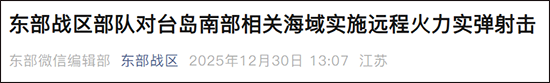 东部战区部队对台岛南部相关海域实施远程火力实弹射击 2025-12-30 14:00 观察者网 微信公众号"东部战区"消息,东部战区新闻发言人李熹海军大校表示,12月30日13时00分,中国人民解放军东部战区陆军部队,协同海军、空军、火箭军等兵力,对台岛南部相关海域,实施远程联合火力突击,并组织实弹射击,取得了预期效果。