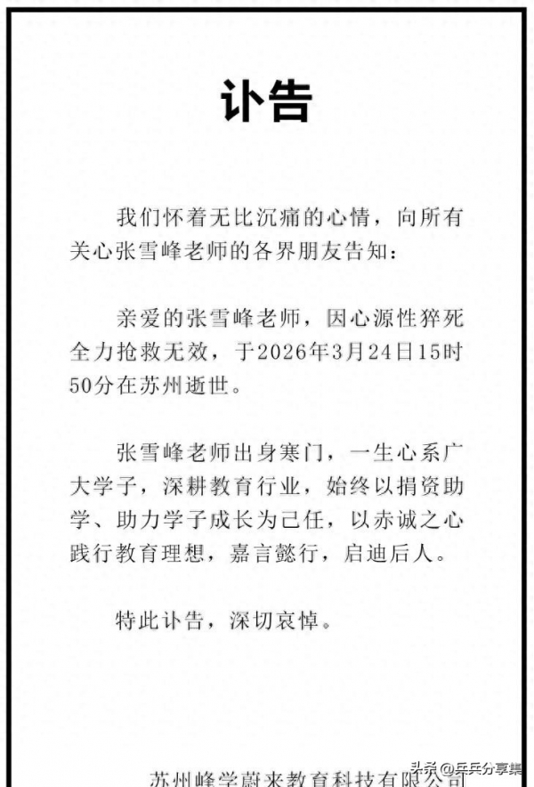 3月24日下午三点五十,苏州那边发的讣告。没写太多,就一句"因突发疾病经全力救治无效"。