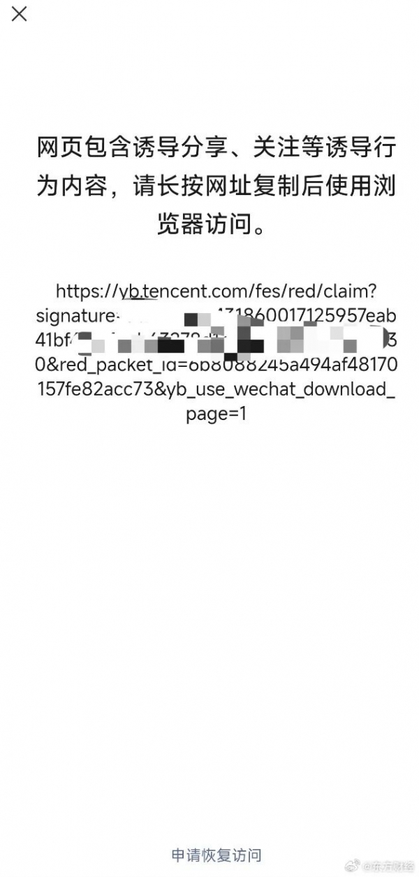 据东方财经,2月4日,记者发现,腾讯元宝红包被微信屏蔽,红包链接已无法正常打开。页面显示,网页包含诱导分享、关注等诱导行为内容,请长按网址复制后使用浏览器访问。