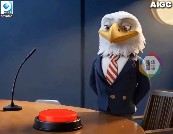 不久后,新华社在海外社交平台发布"白头鹰"系列AI动画的新一集:象征美国的白头鹰按下红色按钮引发爆炸,引得"白鸽们"惊恐万分;白头鹰随即举起盾牌,声称"由我来保障大家的安全"。待不明就里的白鸽聚拢过来,盾牌瞬间化作牢笼将它们困住,而始作俑者狡黠一笑,"有时候,安全意味着要对你们来点控制。"