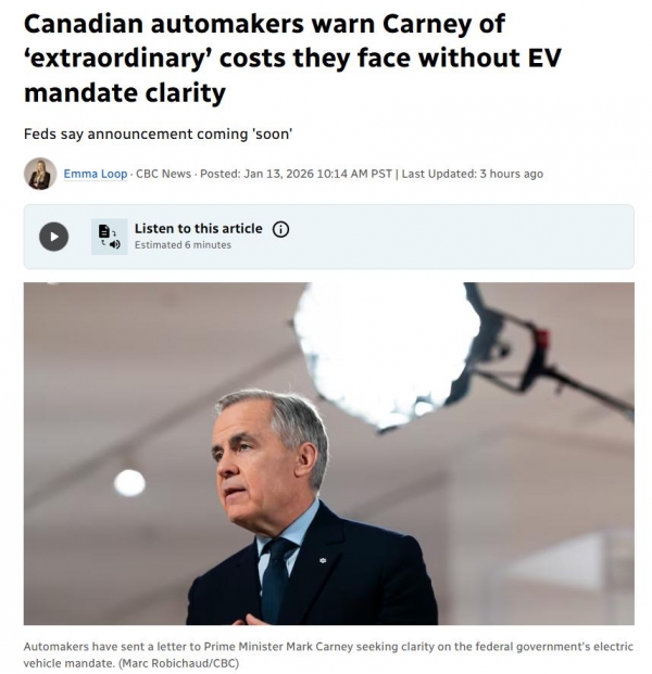据 CBC 报道,三大汽车制造商的高管上个月联名致信卡尼,警告联邦政府在电动车强制令上的拖延,正在给企业带来"巨大且完全没有必要的合规成本"。