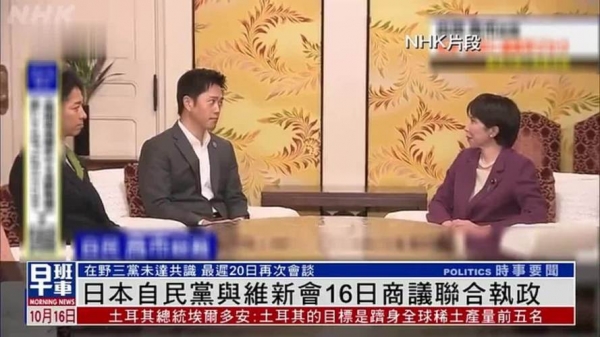 此前据日本共同社报道,自民党与日本维新会已同意就联合执政达成合作,维新会将在首相指名选举中支持自民党总裁高市早苗任首相。
