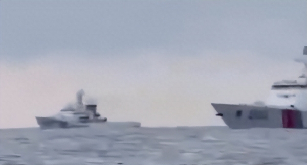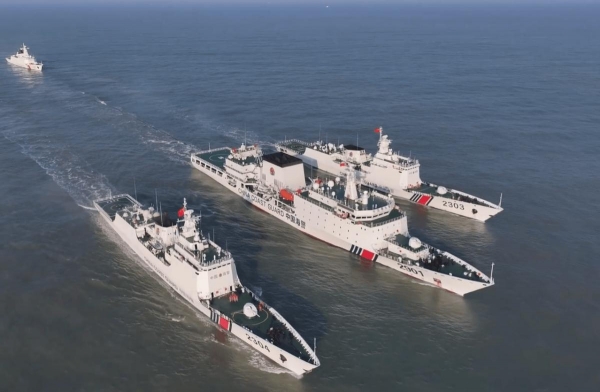 而中国的 4 艘海警船则编队有序,航行中保持着严密的战术间距,舰上的执法设备和武器系统全程处于待命状态,仅凭视觉威慑就形成了压倒性优势。