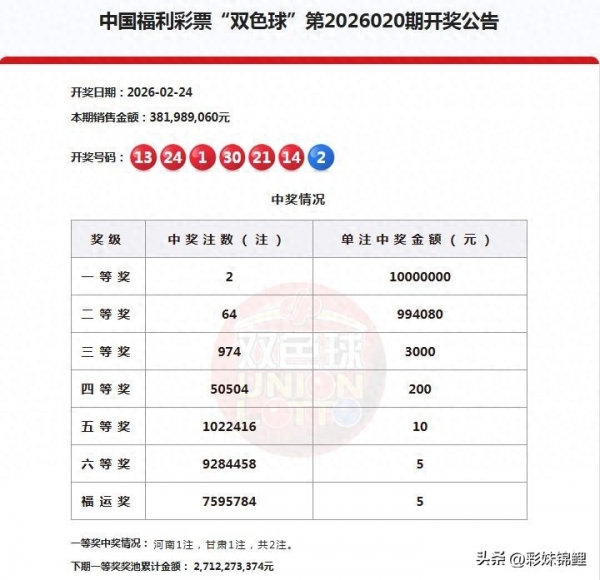 今天2月24日,星期二,晚上双色球26020期开奖出炉了。以下是本期的开奖公告: