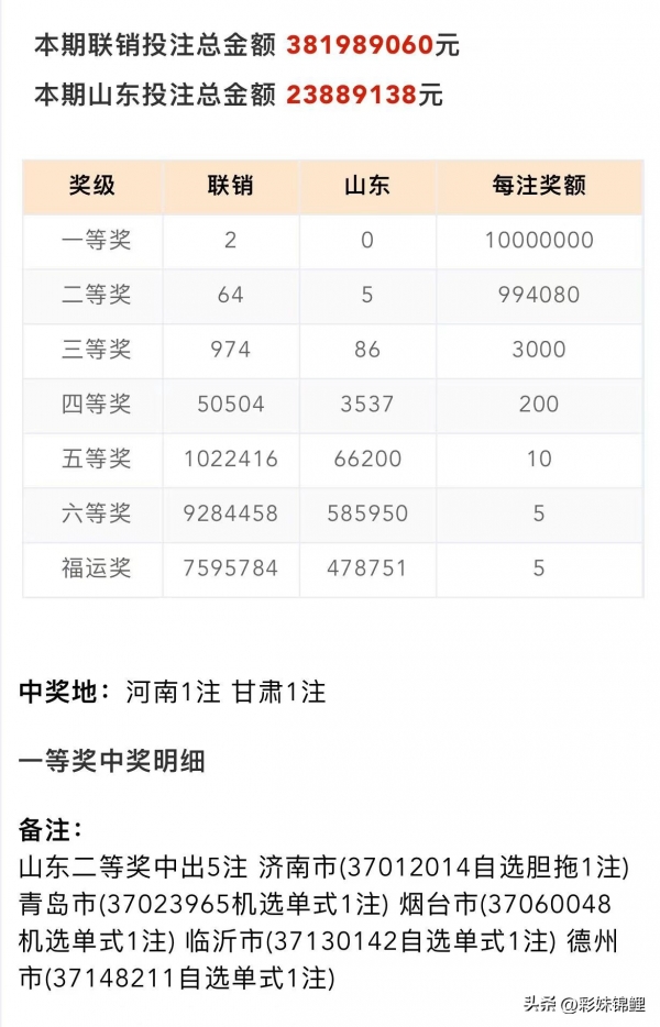 从开奖公告中,我们可以看出本期的开奖情况。一等奖本期开2 注,每注奖金 1000万,一等奖出自河南1注,甘肃1注 。开奖后奖池27.1 亿 ,本期二等奖开出了 64注,每注奖金 99.4万 。本期山东省一等奖0 注。以下是山东省的中奖情况: