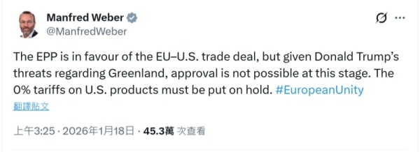 "欧洲人民党支持欧美贸易协议,但考虑到唐纳德·特朗普对格陵兰岛的威胁,现阶段该协议不可能获得批准。必须搁置对美国产品征收0%关税。"韦伯在其X账号写道。