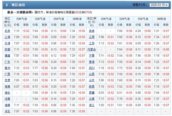回归历史,2026年汽柴油搁浅开端后,自1月下旬以来,短短2个月,国内汽柴油完成4次调价,油价呈现"火箭"上涨的局面。从数据统计分析,1月下旬,2026年汽柴油"首涨"兑现,油价统计上涨85元/吨;2月初,汽柴油今年"第二涨"兑现,油价分别上涨205元/吨和195元/吨;2月下旬,汽柴油"第3涨",油价上涨175元以及170元/吨;3月上旬,本周初,汽柴油迎来今年"第4涨",油价分别上涨695元以及670元/吨!